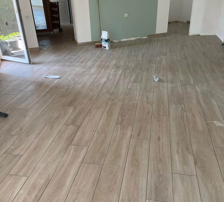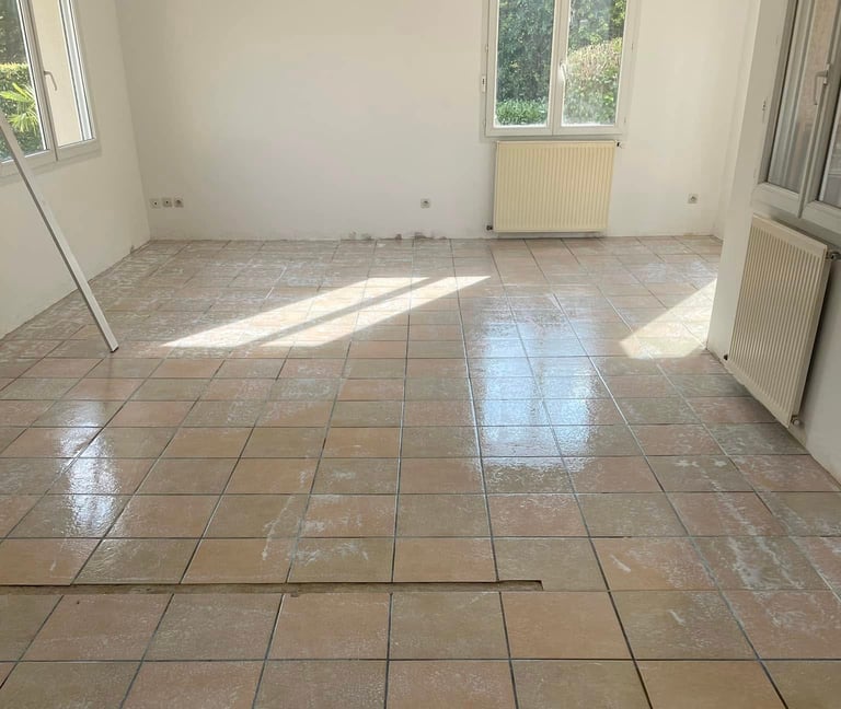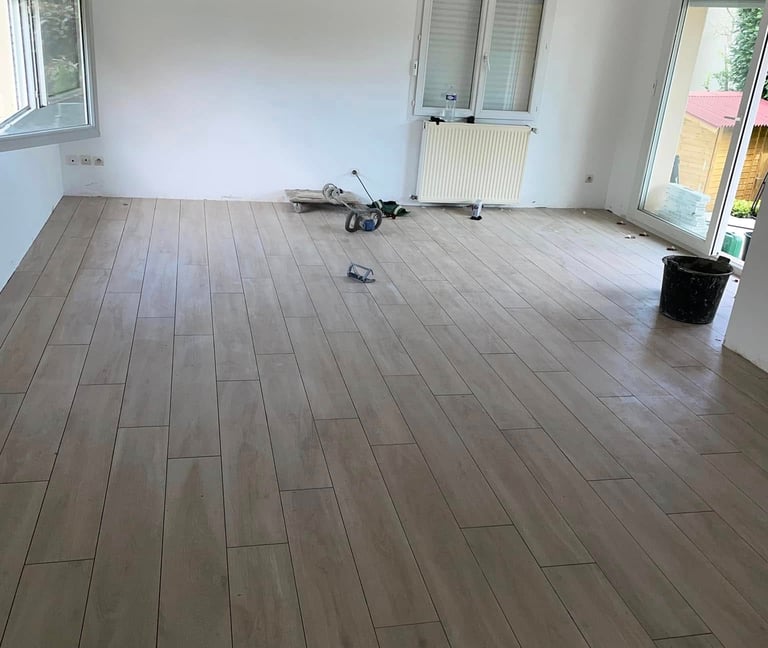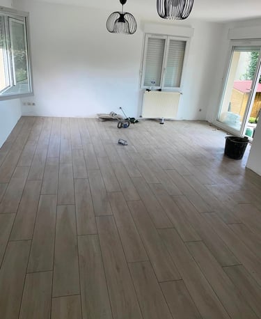 L’ancien carrelage, daté et visuellement chargé, a été entièrement déposé pour laisser place à un revêtement moderne, chaleureux et lumineux. Le nouveau carrelage imitation bois, aux teintes naturelles, a été posé avec soin sur l’ensemble de la surface. Un joint ton pierre a été choisi pour un rendu élégant et discret, accentuant l’effet parquet tout en assurant une finition soignée.