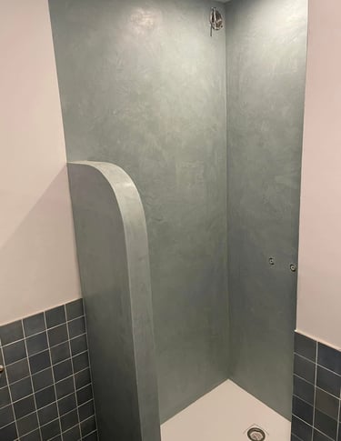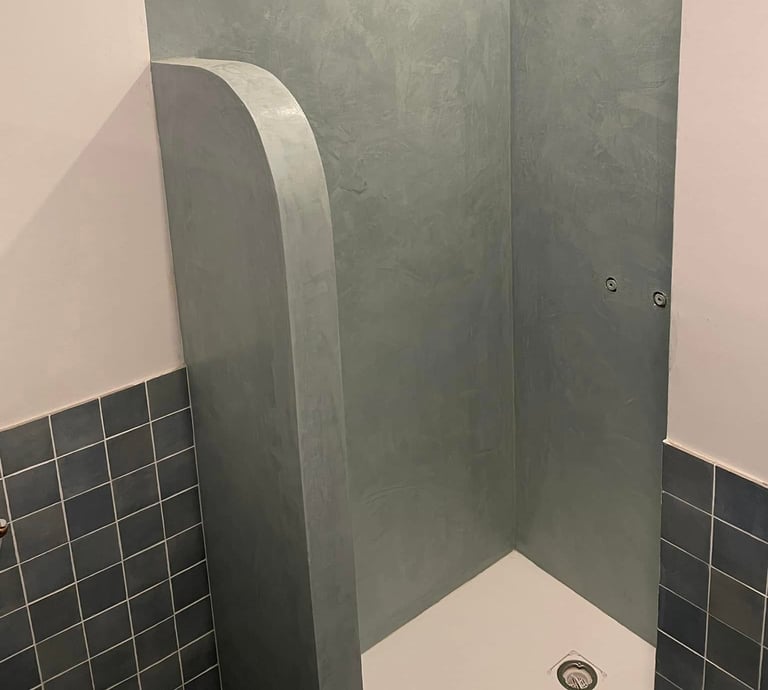 Le projet comprenait l’installation complète d’une douche avec cloison arrondie en enduit effet béton ciré, pour un rendu doux et moderne. Le choix d’une robinetterie dorée encastrée renforce le caractère élégant et contemporain de l’ensemble.