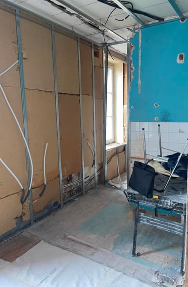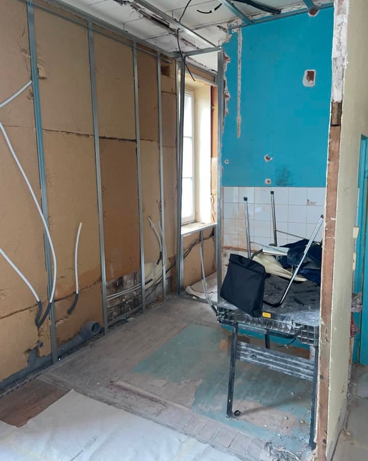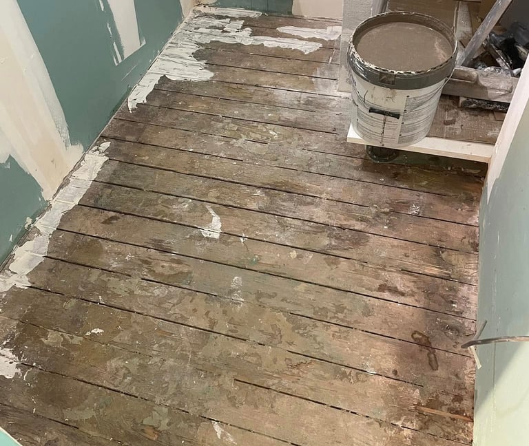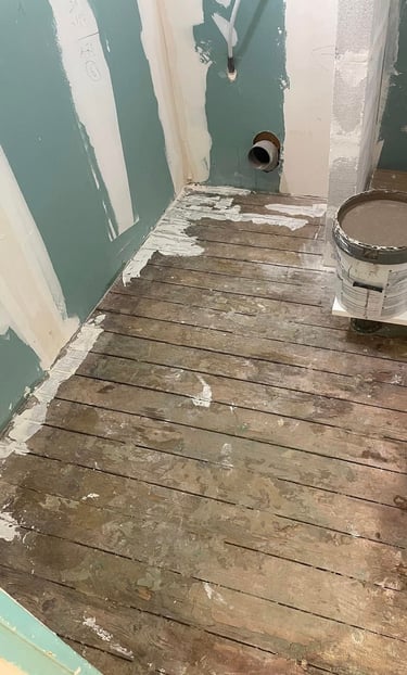Le sol a été repensé avec un carrelage imitation parquet au ton naturel, apportant une ambiance chaleureuse et authentique. Le bas des murs a été habillé de carreaux carrés bleus posés à mi-hauteur, créant un contraste visuel harmonieux.
