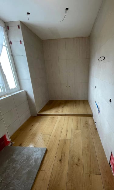 Le sol a été habillé d’un carrelage imitation bois pour un rendu chaleureux et harmonieux. Un meuble vasque suspendu au design épuré et des rangements discrets viennent parfaire l’ensemble. Le nouvel agencement offre un confort visuel et pratique, en totale rupture avec l’espace d’origine. Enfin, une nouvelle douche a été rajoutée dans le coin opposé de la pièce, laissant le choix entre rapidité et plaisir.
