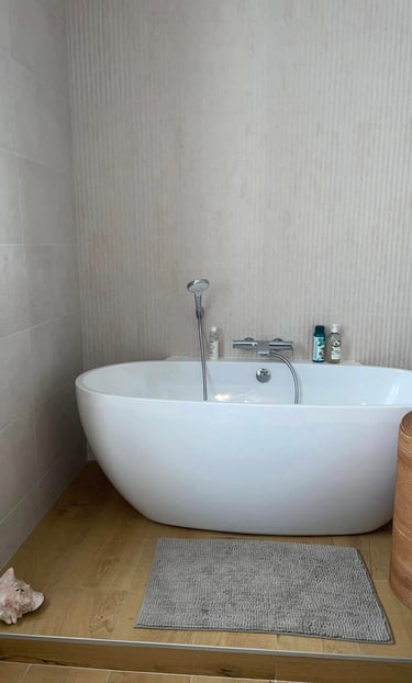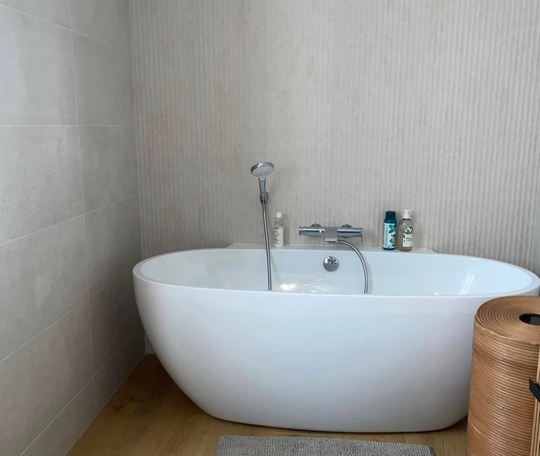 L’ancienne cabine de douche a laissé place à une baignoire îlot, installée sur une estrade en bois pour un effet spa à domicile. Le revêtement mural a été remplacé par un carrelage grand format et des lames verticales texturées qui apportent de la hauteur à la pièce.