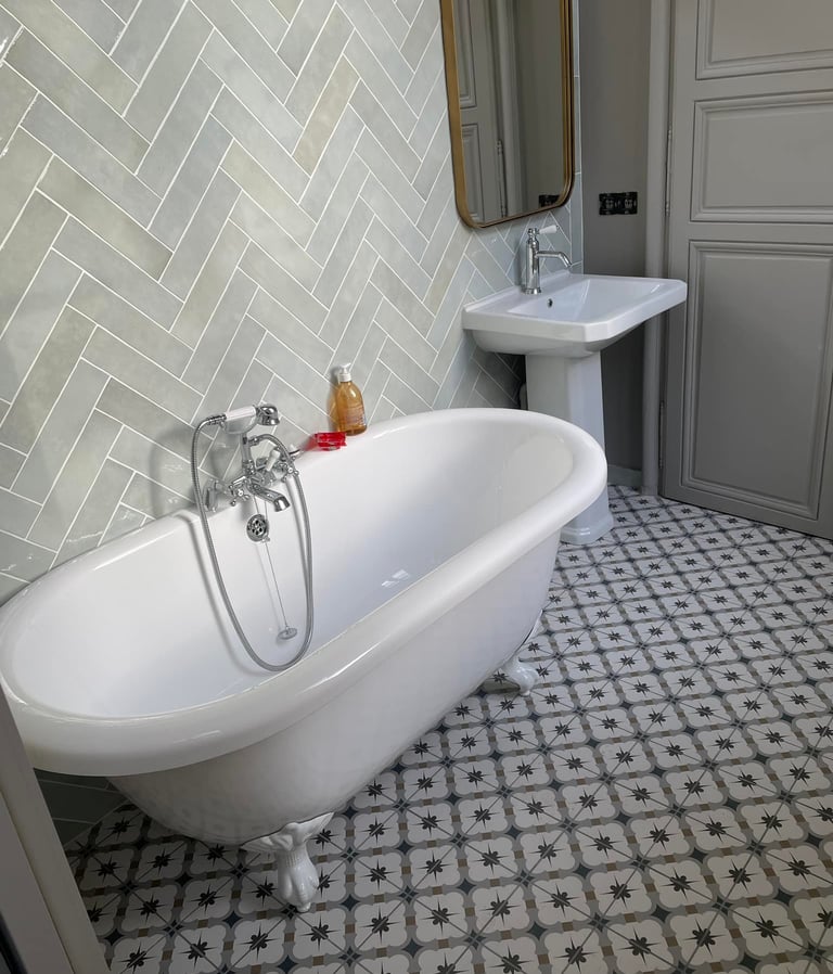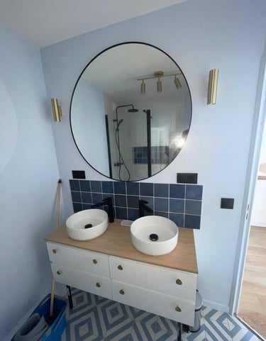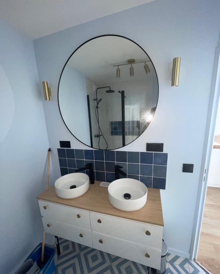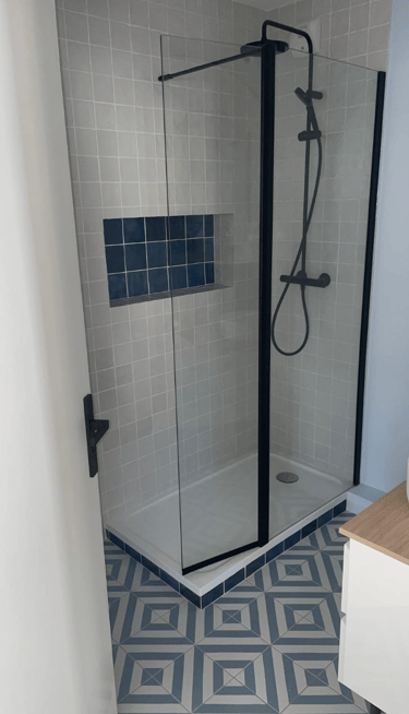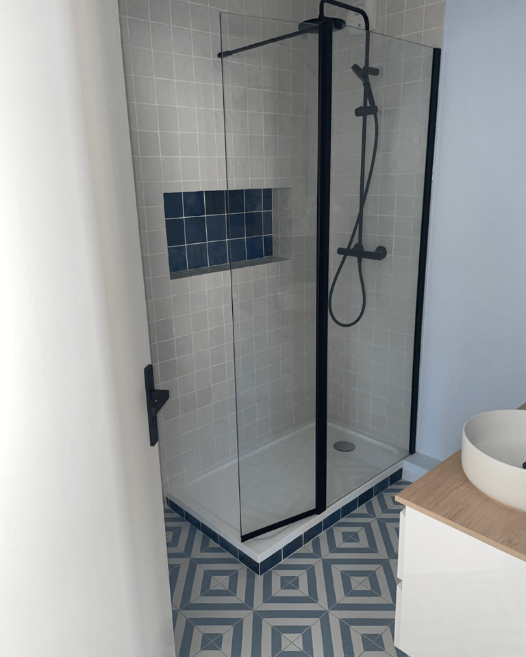 Le carrelage est l’élément phare d’une salle de bain réussie. Ici, le choix s’est porté sur un carrelage de sol à motifs géométriques bleu et blanc, parfaitement aligné, apportant une touche graphique et moderne.