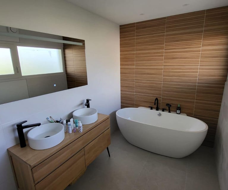 Le choix du revêtement de sol est essentiel. Nous posons des carrelages antidérapants ou des revêtements PVC adaptés aux environnements humides. Sur l’un de nos récents chantiers, le sol a été entièrement rénové avec un carrelage imitation bois (120x20 cm), associé à un joint ton pierre : un rendu chaleureux, moderne, et parfaitement étanche.