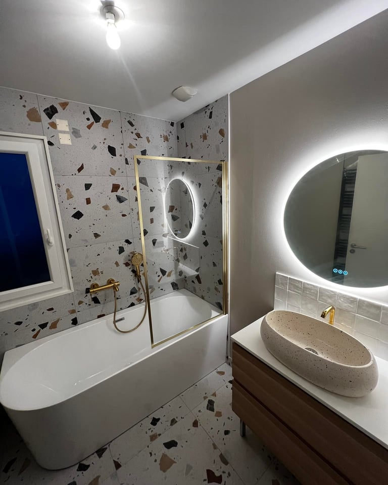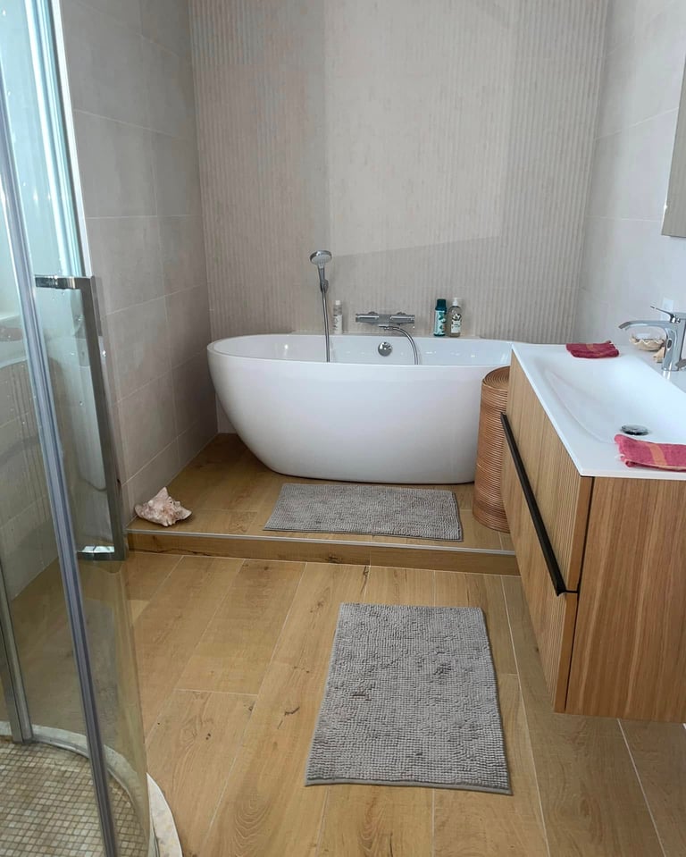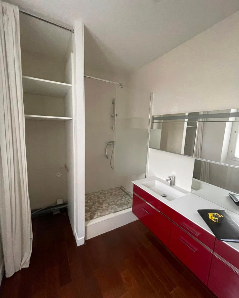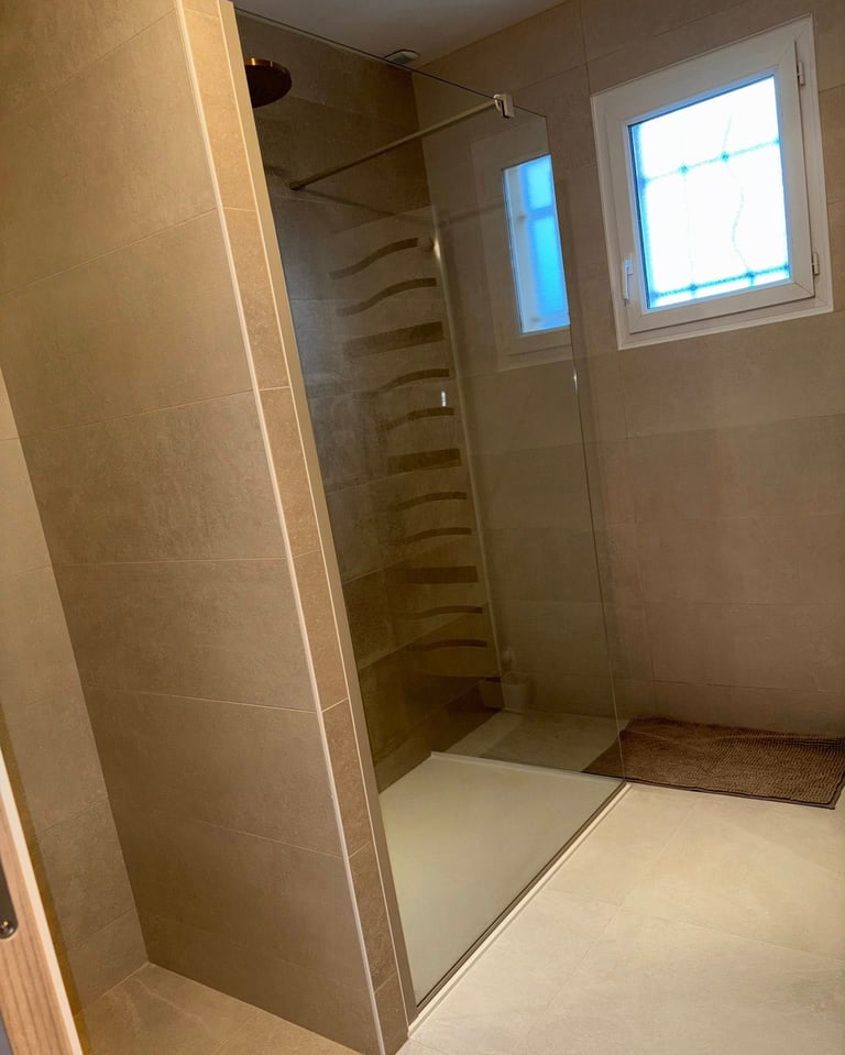 L’ancienne baignoire, typique des années 90, a été déposée pour laisser place à une douche à l’italienne spacieuse, avec receveur extra-plat et paroi vitrée.