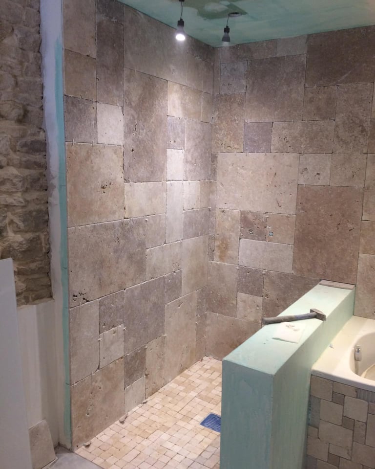 Cette salle de bain a été entièrement rénovée avec un habillage en pierre naturelle travertin, offrant un rendu authentique et chaleureux.